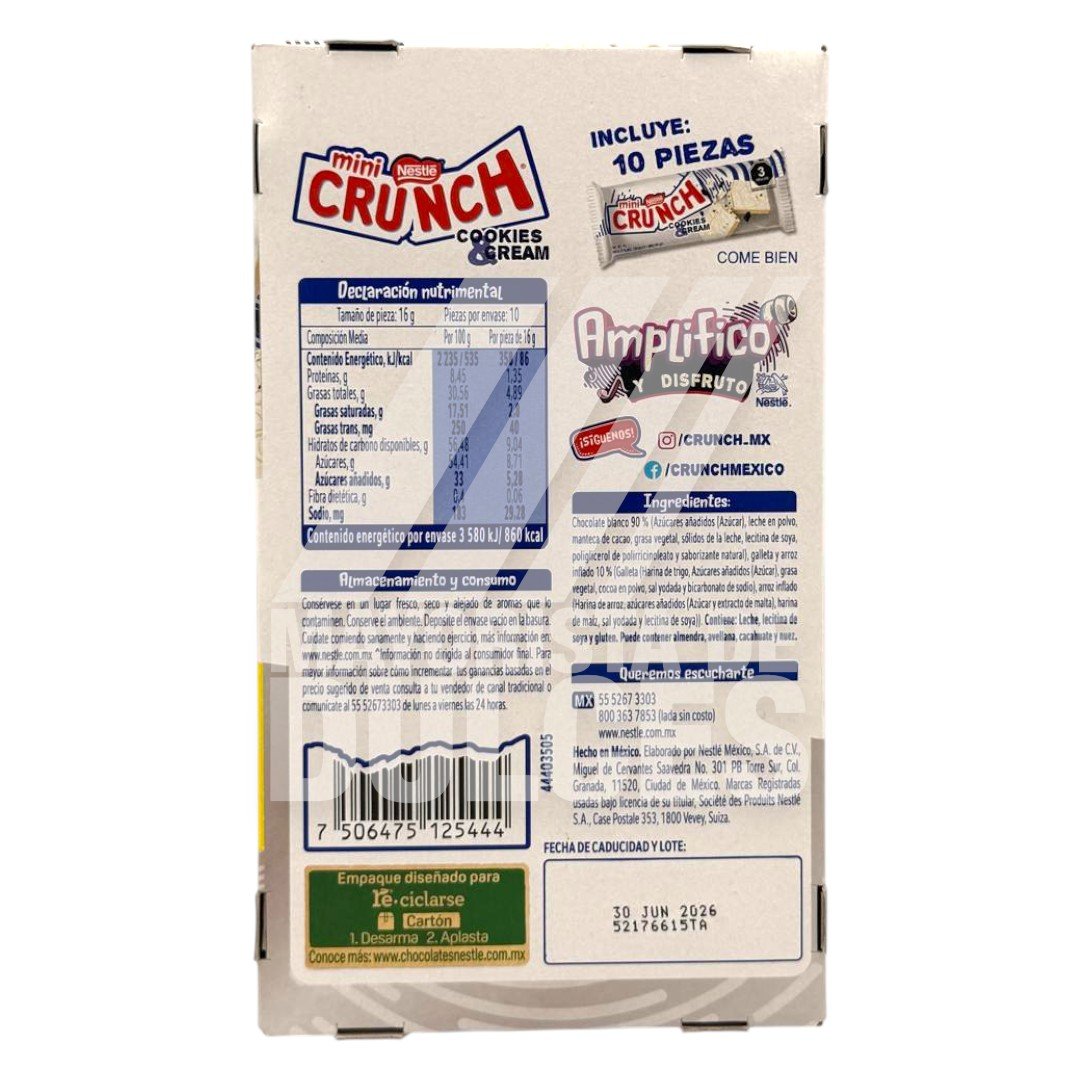 Descripción del producto: 🍫🍪 El **Chocolate Crunch Cookies & Cream de Nestlé** combina la textura crujiente que todos aman con el inconfundible sabor a galleta y crema 😋✨. Cada barra ofrece una deliciosa mezcla de chocolate blanco cremoso con trocitos de galleta de cacao 🍪, creando una experiencia dulce y balanceada en cada mordida 🤩. Su tamaño individual es perfecto para lunch, antojos o venta en mostrador 🛒. Cada paquete contiene 10 piezas listas para exhibir o compartir, y la caja con 8 paquetes 📦 brinda una excelente presentación para dulcerías, tiendas y puntos de venta 🏪.